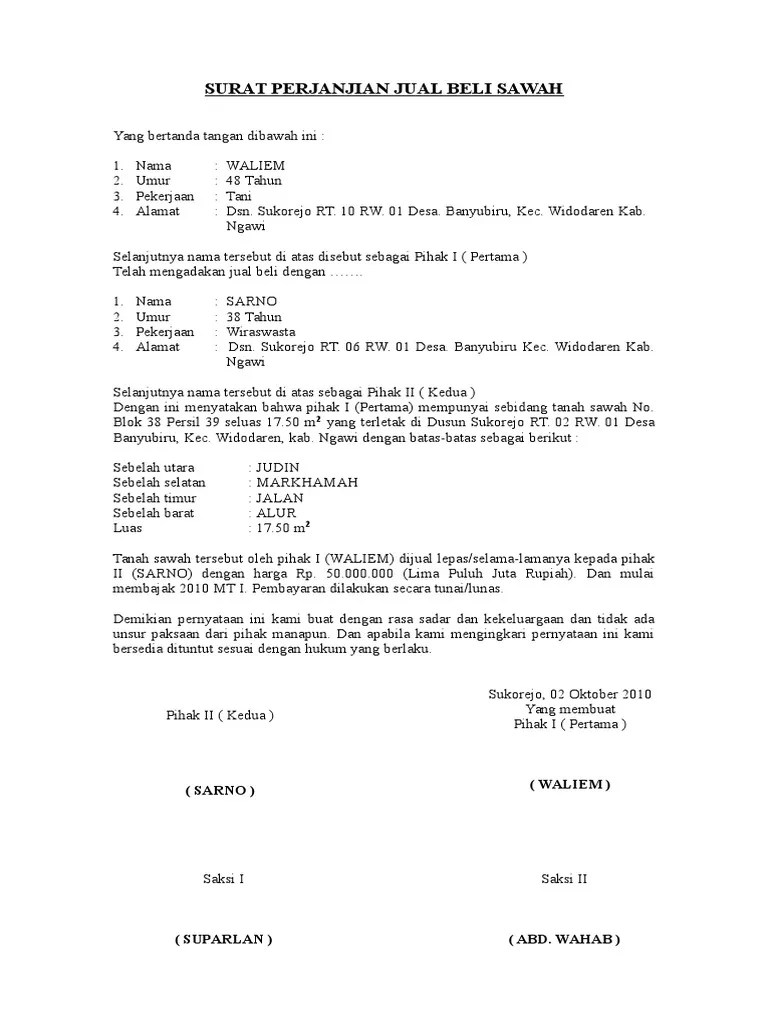 Saat melakukan transaksi ini, harap diperhatikan surat perjanjiannya. Unduh file doc nya di sini. Simak contoh surat tersebut dan 8 hal penting yang . Pasal 4 surat perjanjian ini dibuat rangkap 3 di atas materai senilai 6000 ( enam ribu ) yang diantara pemegang surat ini adalah :